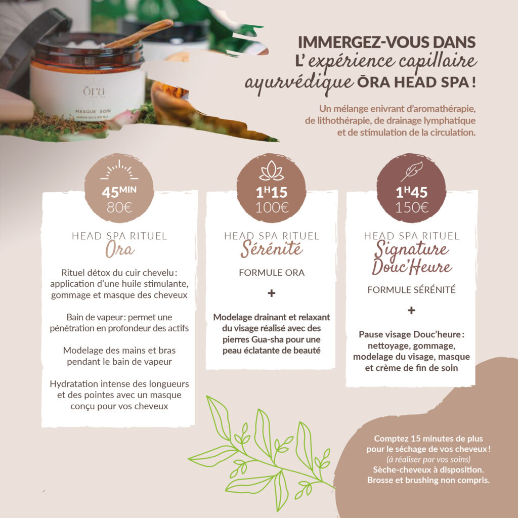 Immergez-vous dans l’expérience capillaire ayurvédique ōra head spa ! Un mélange enivrant d’aromathérapie, de lithothérapie, de drainage lymphatique et de stimulation de la circulation.